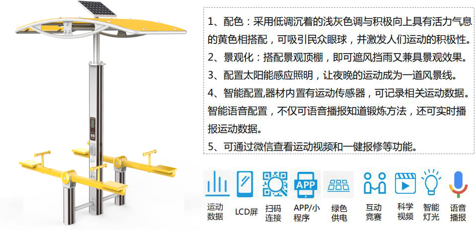 kaiyun开云电竞全民健身产品涵盖健身路径、运动场馆、篮乒气羽排等产品,分为多个系列,先进的制造工艺、严苛的质量检测,确保产品性能优良、品质安全可靠,让运动简单科学。并将全民健身器材(户外路径器材、体育场馆等产品)进行智能化升级和互联,实现全人群覆盖、全场景智能,让运动赞美生活。