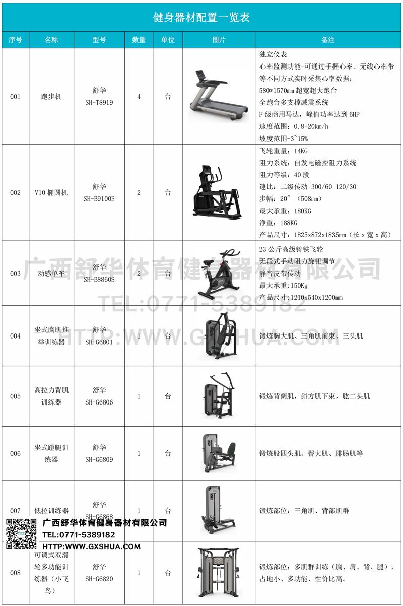 小飞鸟(1台)、标准式框架训练器(1台)、多重可调节练习椅(1台)、腹肌训练器(1台)、罗马椅、10付哑铃套组(1套)、可调哑铃凳(1台),可以实现对不同肌肉群的针对性训练,满足肌肉训练需求,全方位激活身体机能。