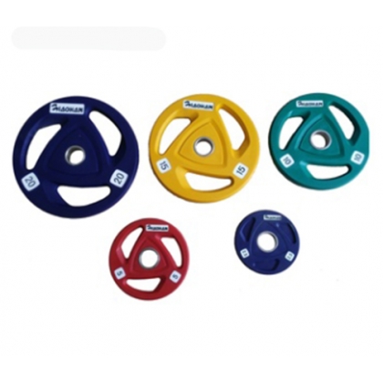 pu杠铃片参数:外圆直径10kg-20kg450mm,中孔50mm,重量误差3‰,外包含45%聚氨酯制作而成,内包铸铁,外包彩色pu,外观漂亮,环保无味,耐磨,抗摔,坚固耐用,永久免维护